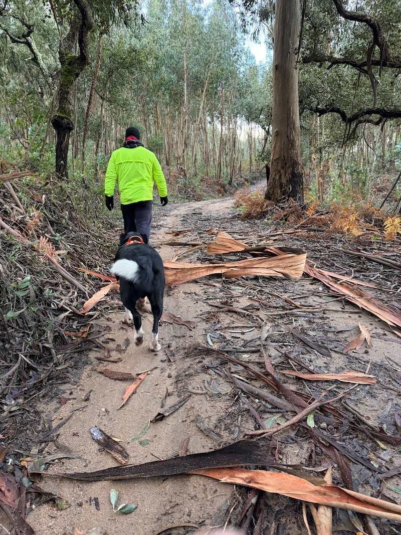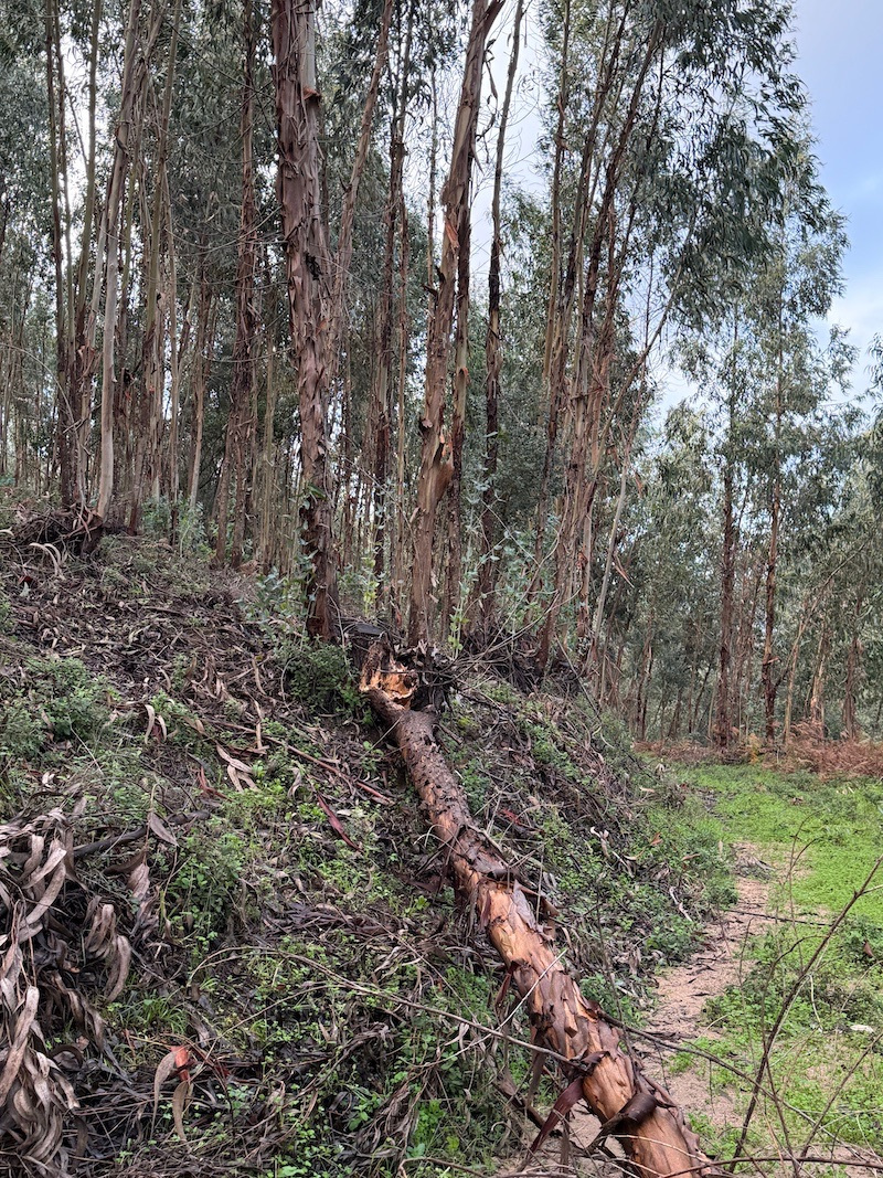 Iltapäivä oli jo pitkällä kun oltiin vihdoin taas mökillä. Söimme ja lähdimme vähän pidemmälle kävelylenkille, koska aamulenkki jäi tekemättä. Mökillä ei tuullut, mutta kun menimme rinteen pohjoispuolelle, siellä olikin aivan mahdoton tuuli! Eucalyptukset taipuivat monta metriä ja yksi oli juuri kaatunut polullekin. Tiellä oli isoista eucoista irronneita kuoria ja vähän hirvitti kävellä niiden alta, kun ei tiennyt mitä sieltä niskaansa saa! Suunnistimme äkkiä taas rinteen eteläpuolelle rauhallisemmille maille. Sadekaan ei yllättänyt, vaikka sitä oli koko päiväksi luvattu.